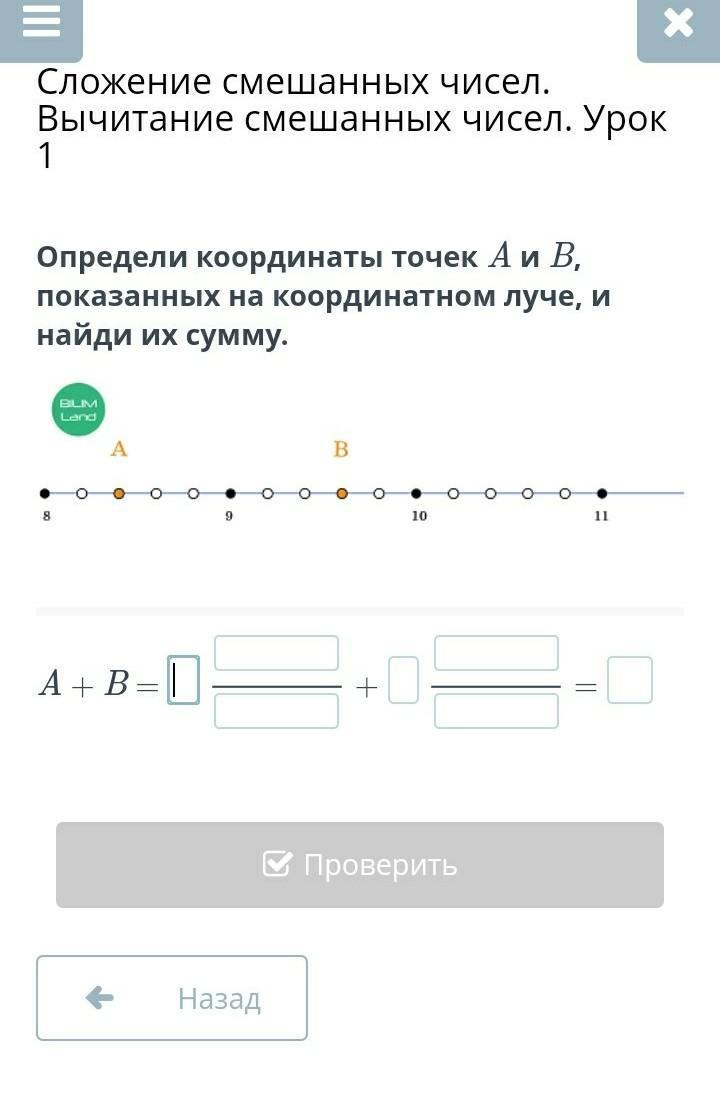 Определи координаты точек A и B, показанных на координатном луче, и найди их сумму.