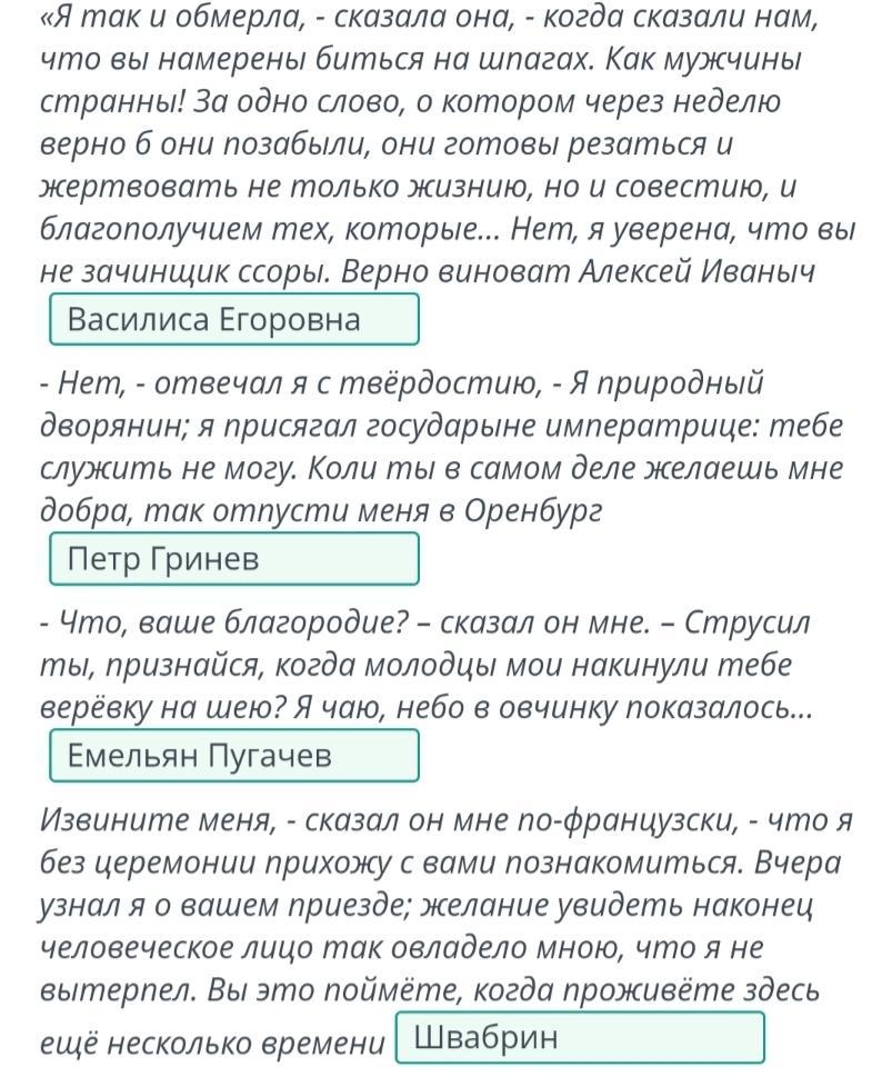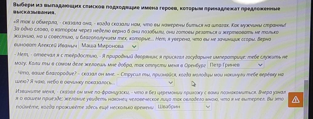 Выбери из выпадающих списков подходящие имена героев, которым принадлежат предложенные
