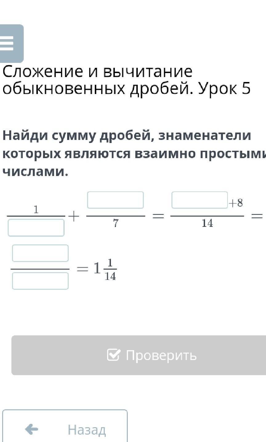 Найди сумму дробей, знаменатели которых являются взаимно простыми числами.