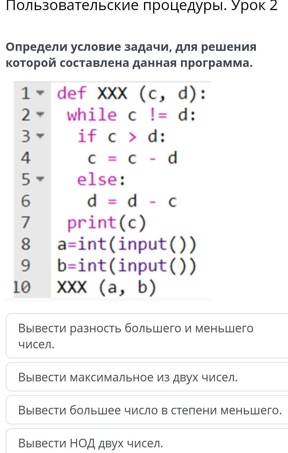 Видим while c != d и сразу понимаем, что может быть только НОД (из этих вариантов)