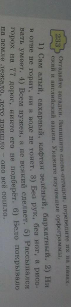 223.Отгадайте загадки.Запишите слово- отгадки переведите их на казахсаий и английский языки.Укажите изученные орфограммы.