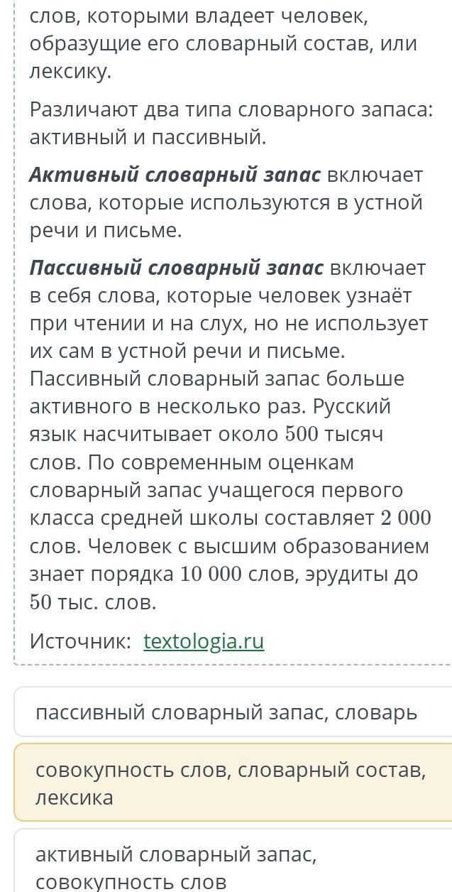 Ответ:совокупность слов, словарный состав, лексика