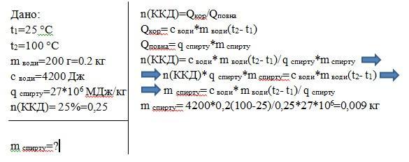 кипіння 200 г води, взятої при температурі 25 °С. ККД спиртівки