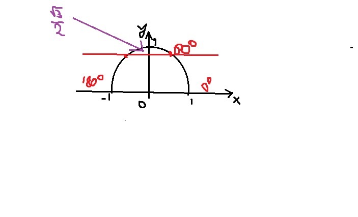Рисуем единичную полуокружность, т.е. ее радиус равен единице. Расстояние от точки пересечения осей до окружности равно 1. Градусная мера полуокружности - 180°. Нас интересует угол 60°. 180:60=3, т.е. наш угол составляет третью часть полуокружности. Делим нашу дугу на три равные части (красные точки). Проводим прямую через первую точку параллельно оси ОХ (горизонтально). Почему? Да потому что синус - это у, косинус - это х. Нам нужен синус. Следовательно, мы должны провести прямую так, чтобы она пересекала ось ОУ. И она пересекает ее в точке