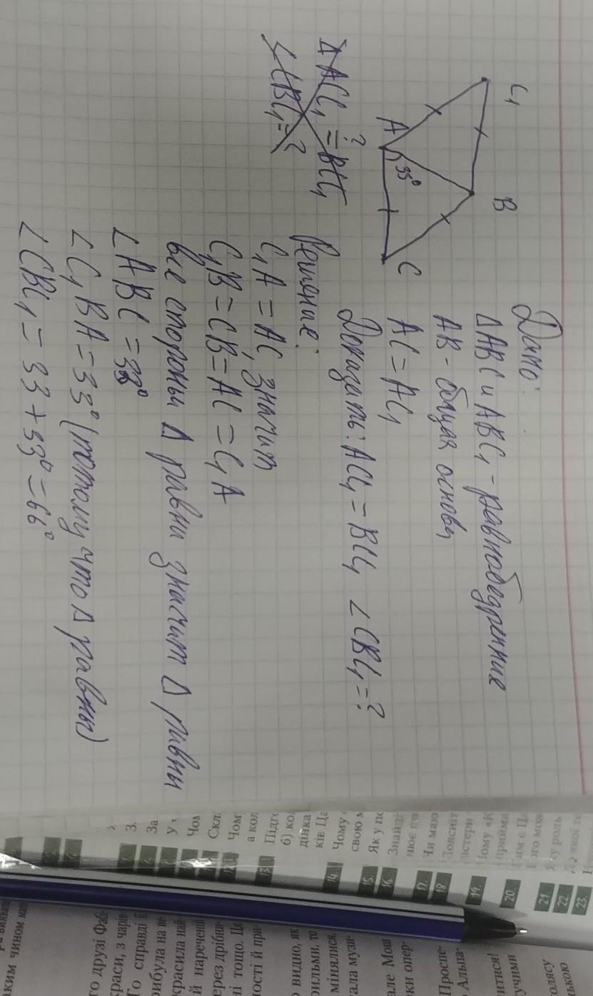 Треугольники ABC и ABC1 – равнобедренные с общим основанием AB. ∠СAB = 33°. AC = AC1. Докажите равенство треугольников ACC1 и BCC1.Найдите градусную меру угла ∠CВC1