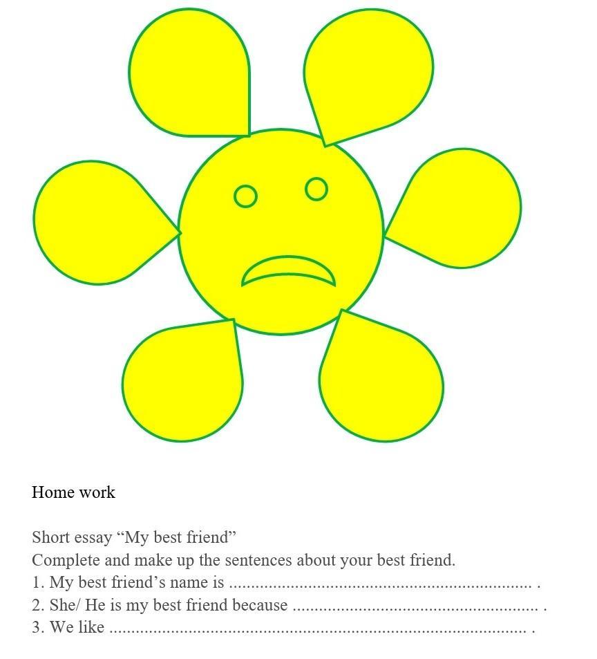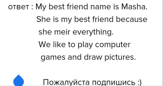 Перевод Домашние задание НАПИШИ О СВОЁМ ДРУГЕ 1)ИМЯ МОЕГО ЛУЧШЕГО ДРУГА....... 2)ОНА/ОН ЛУЧШАЯ /ЛУЧШИЙ ДРУГ ПОТОМУ ЧТО...... 3)МЫ ЛЮБИМ.......