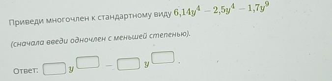 приведи многочлен к стандартному виду 6,14у⁴-2,5у⁴-1,7⁹ (сначала введи многочлен с меньшей степенью)