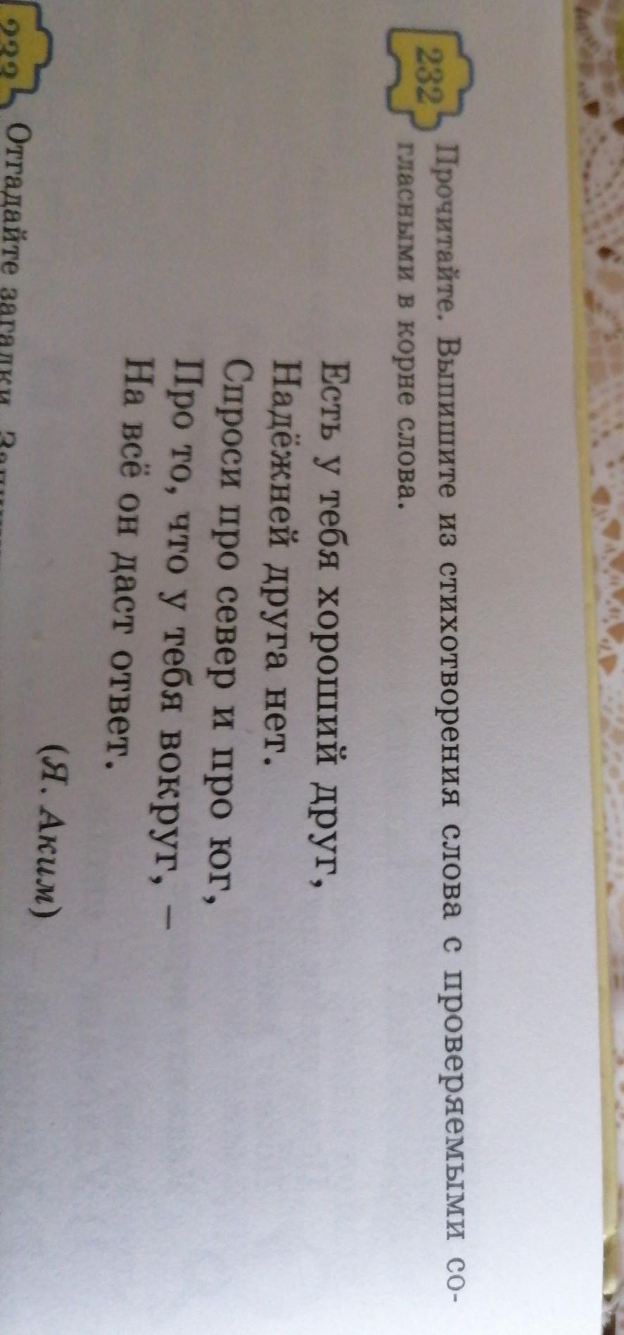 прочитайте. выпишите из стихотварения слова с проверяемыми согласными в корне слова