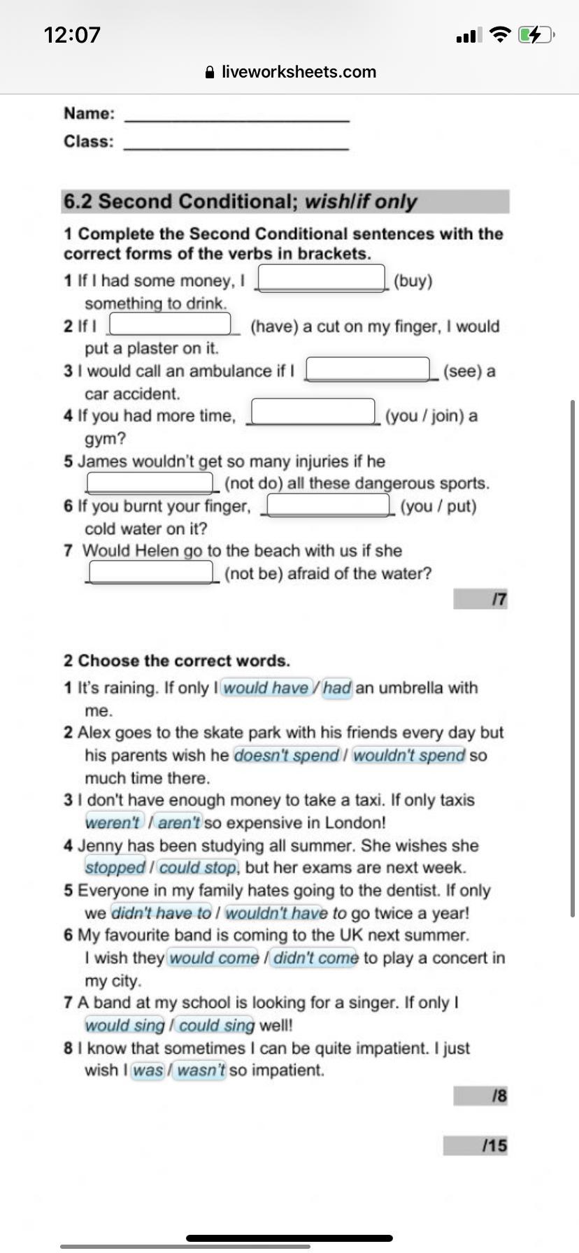 1. If i had some money, i had bought something to drink. 2. If i had a cut on my finger, i would put a plaster on it. 3. I would call an ambulance if i saw a car accident. 4. If you had more time, you joined a gym? 5. James wouldn`t get so many injuries if he not doing all these dangerous sports. 6. If you burnt your finger, you put cold water on it? 7. Would Helen go to the beach with us if she not being afraid of the water. (Выполнена только первая часть)