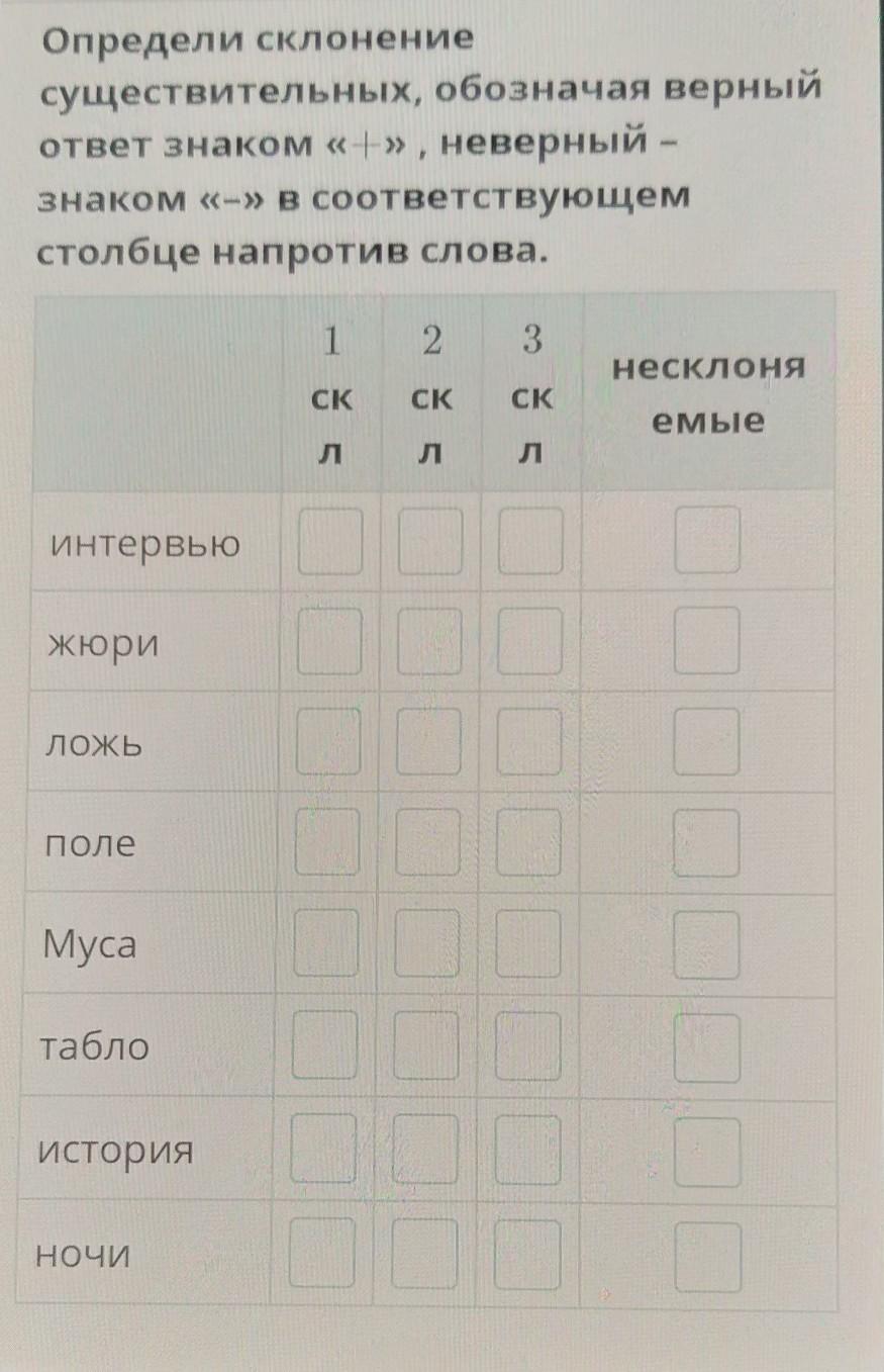 Вам только остаётся (+) и (-) внести в таблицу напротив указанных слов.