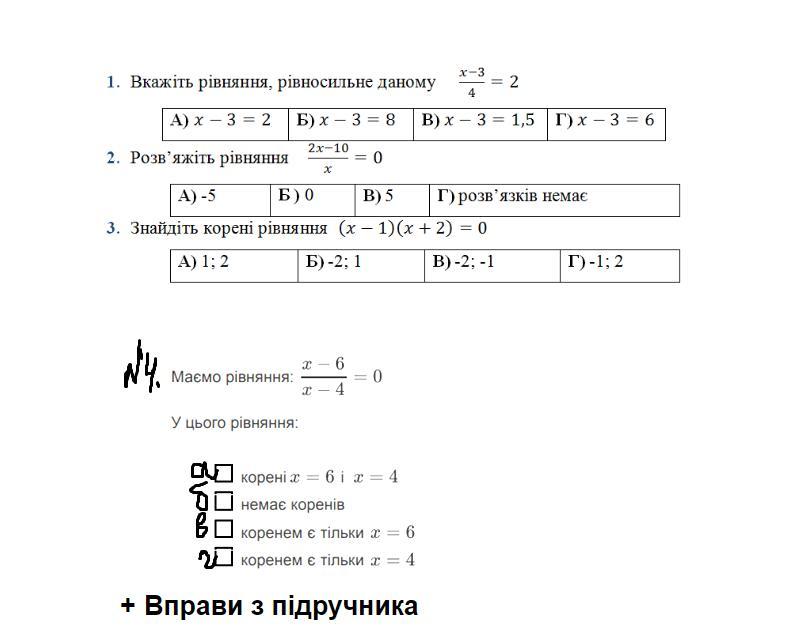 4) В знаменателе не может быть 0, так как деление на 0 запрещено. x не может быть равен 4, т.к. 4-4 = 0. При x = 6 числитель равен 0, знаменатель равен 2. 0 : 2 = 0. Переменная для x найдена.