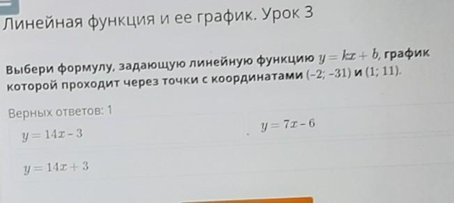 выбери формулу задающую линейную функцию y=kx+b,график которой проходит через точки с координатами (-2;-31) и (1;11)