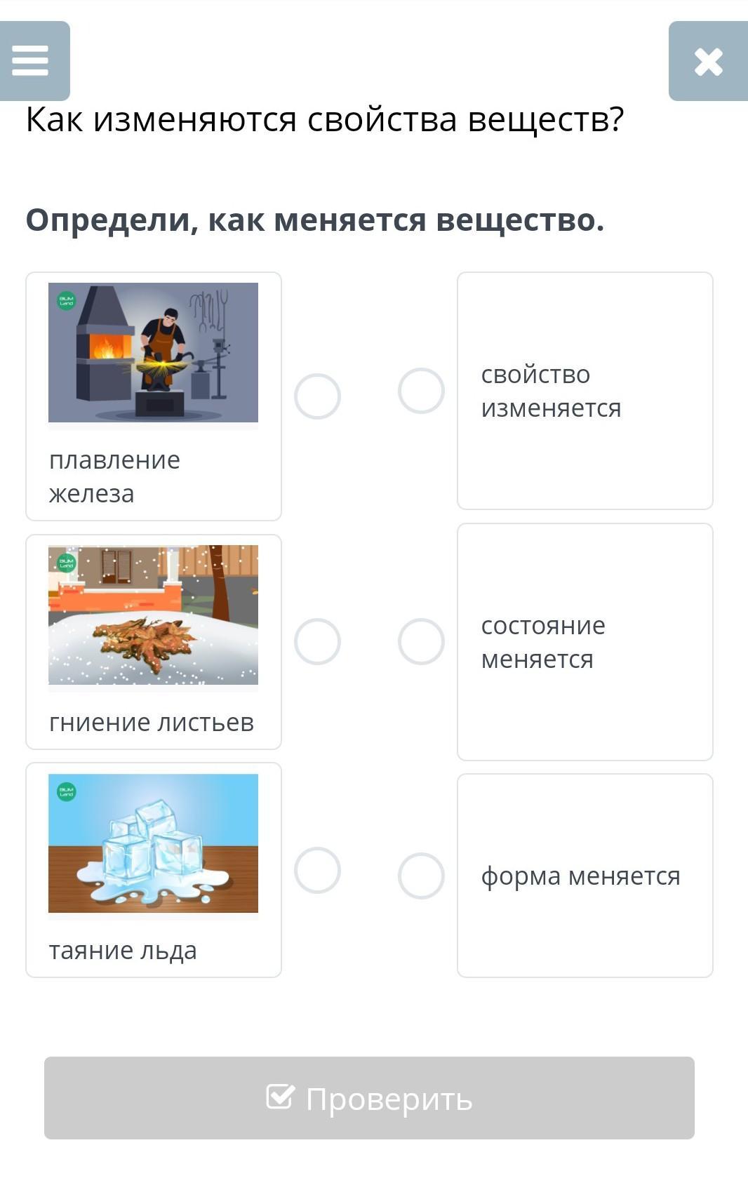 Плавление железа меняется форма.Гниение листьев меняется свойство.Таяние льда меняется состояние.)