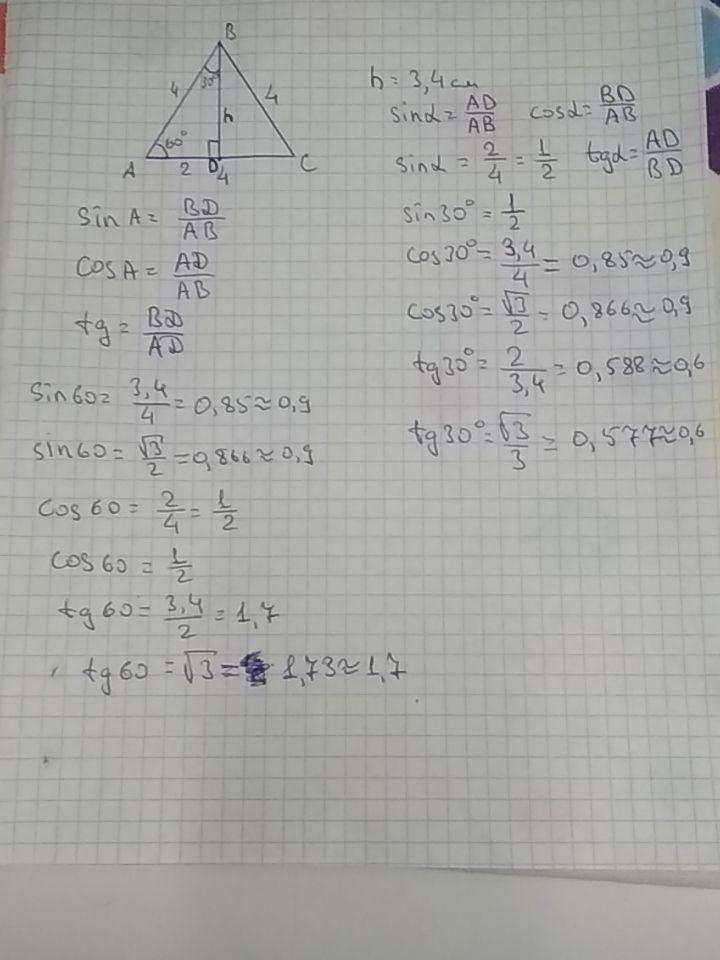 Начертите равносторонний треугольник и Проведите его высоту сделайте необходимые измерения и Вычислите значения тригонометрических функций углов 30 градусов и 60 градусов Сравните полученные результаты с табличными