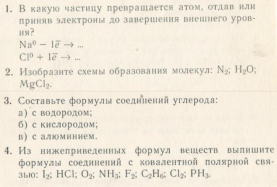 1) Na+1; Cl-1 3) а) CH4, б) CO, в) Al4C3 4) HCl; NH3; C2H6; PH3