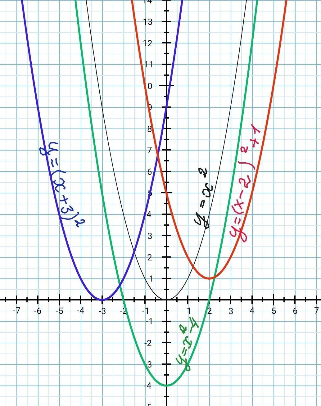 Переносим график функции у=х^2 на 3 клетки влево по оси ОХ. (синий график)