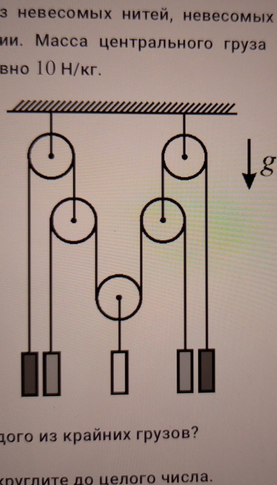 находится в равновесии. Масса центрального груза равна 2 кг. Ускорение