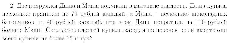 Ответ:Даша купила 5 пряников, Маша 6 шоколадных батончиков.