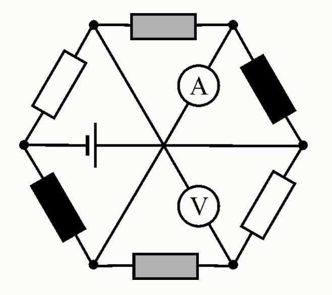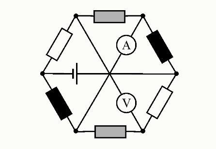 лектрическая цепь состоит из идеальной батарейки с напряжением на выводах 9 В, идеального амперметра, идеального вольтметра и 6 резисторов. Сопротивление каждого белого резистора равно 1 кОм, каждого чёрного –