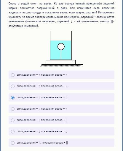 Сосуд с водой стоит на весах. Ко дну сосуда ниткой прикреплён ледяной шарик, полностью погружённый в воду. Как изменятся сила давления жидкости на дно сосуда и показания весов, если шарик растает? Испарением жидкости за время эксперимента можно пренебречь. Стрелкой ↑ обозначается увеличение физической величины, стрелкой ↓ – её уменьшение, знаком ||– отсутствие изменений.