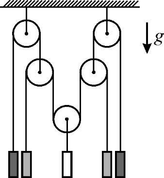 Система, состоящая из невесомых нитей, невесомых блоков и пяти грузов, находится в равновесии. Масса центрального груза равна 2 кг. Ускорение свободного падения равно 10 Н/кг.