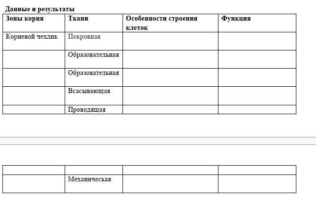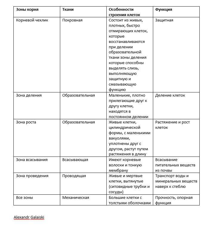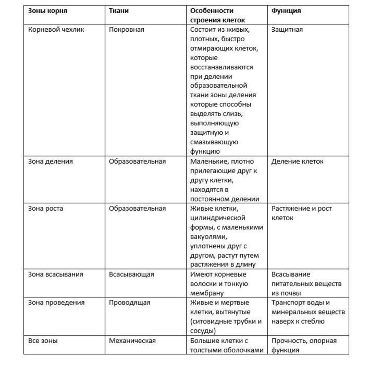 Таблица, зоны корня, ткани, особенности строения клеток, функции
