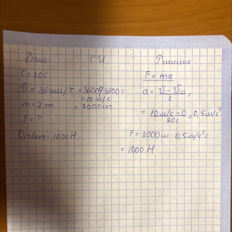 Автомобиль за 20с развивает скорость 36 км/ч. Найдите силу, сообщающую ускорение, если масса автомобиля 2 т?