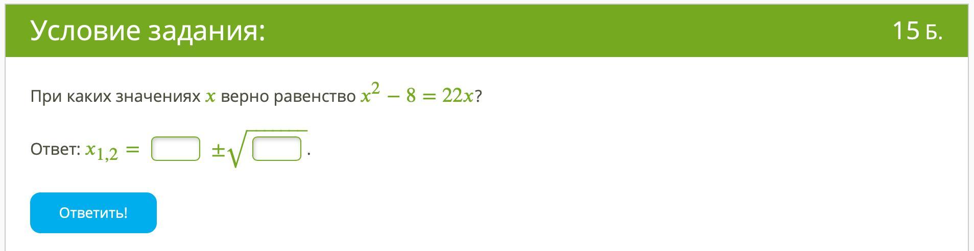 {x}^{2}  - 8 = 22x \\  {x}^{2}  - 22x - 8 = 0 \\ d =  {22}^{2}  - 4 \times ( - 8) = 484 + 32 = 516  \\ 1) \: x =  \frac{22 +  \sqrt{516} }{2}  =  \frac{22 + 2 \sqrt{516} }{2}  = \frac{2(11 +  \sqrt{129}) }{2}  = 11 +  \sqrt{129}  \\ 2) \: x =  \frac{22 -  \sqrt{516} }{2}  =  \frac{22 - 2 \sqrt{129} }{2}  =  \frac{2(11 -  \sqrt{129} )}{2}  = 11 -  \sqrt{129}  \\  \\ otvet =  > x1.2 = 11 +  -  \sqrt{129}