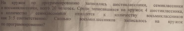 Далее 3 и 5 умножаем на 2 и получаем 6 семиклассников и 10 восьмиклассников