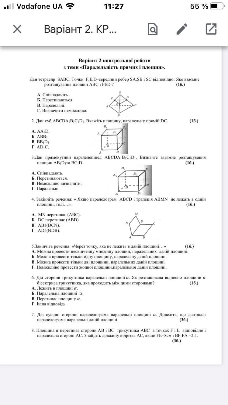 № 7 - диагональ параллелограмма лежит в той же плоскости, что и стороны параллелограмма; а так как стороны параллелограмма параллельны плоскости α, то и его диагональ также параллельна плоскости α.