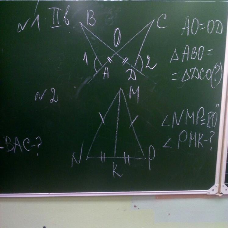 1. треугольники АОВ и ДОС равны по стороне АО=ОД (по условию) и прилегающим углам: А=Д как смежные с равными углами 1 и 2 (по условию) и углами "О" вертикальные.