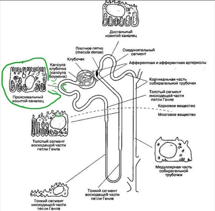проксимальный каналец - сегмент нефрона, начинающийся от почечного полюса капсулы Боумена до начала петли Генле. (см. рисунок)