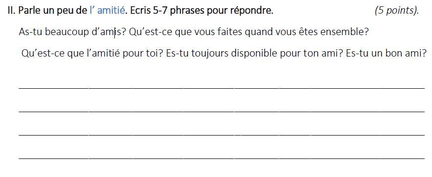 J'ai beaucoup d'amis. Nous allons au cinéma, nous promenons dans le parc et lisons des livres. Pour moi, l'amitié est la réactivité, la sincérité et la gentillesse. Un véritable ami peut vous écouter et vous donner les bons conseils. Je suis toujours en contact avec mes amis. Je me considère comme un bon ami.