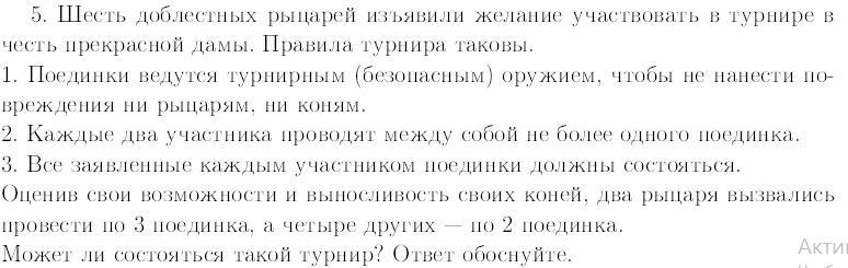 Если посчитать что каждый играл с каждым, получим 5 + 4 + 3 + 2 + 1 = 15 поединков. А в данном турнире получается 14 поединков. Такого быть не может, так как убирая 1 поединок у одного рыцаря мы уберем этот поединок и у того, с кем он собирался играть, а значит 14 и любое другое четное число поединков невозможно.