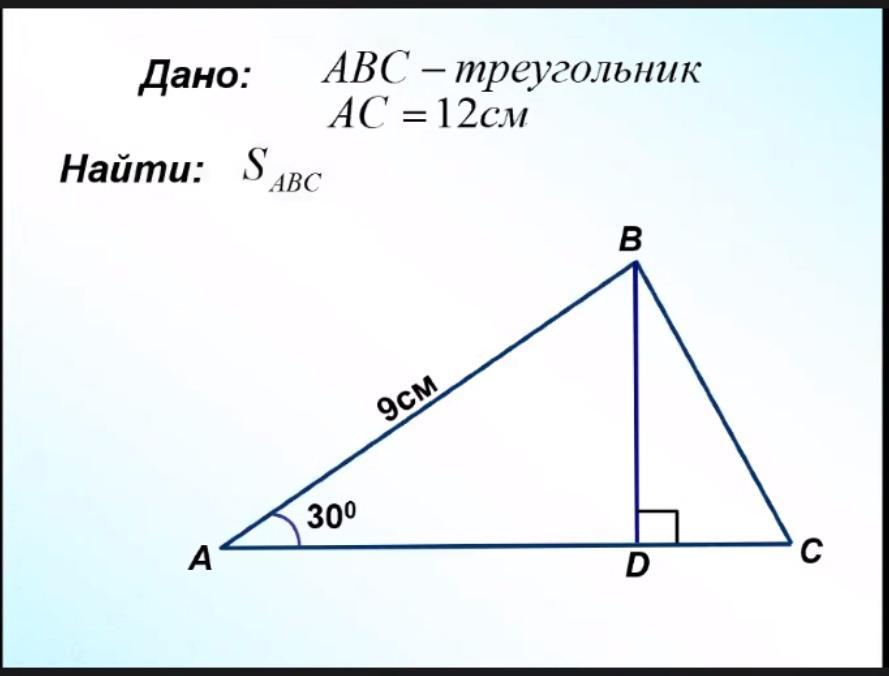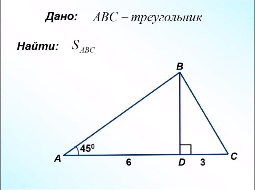 S(ABC)=BD*AC/2=6*(6+3)/2=6*9/2=27см².