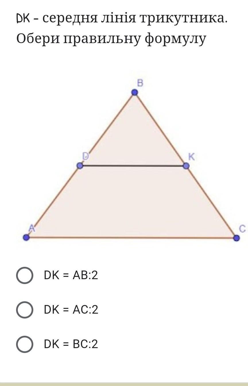 Середня лінія трикутника паралельна одній із його сторін і дорівнює половині цієї сторони.