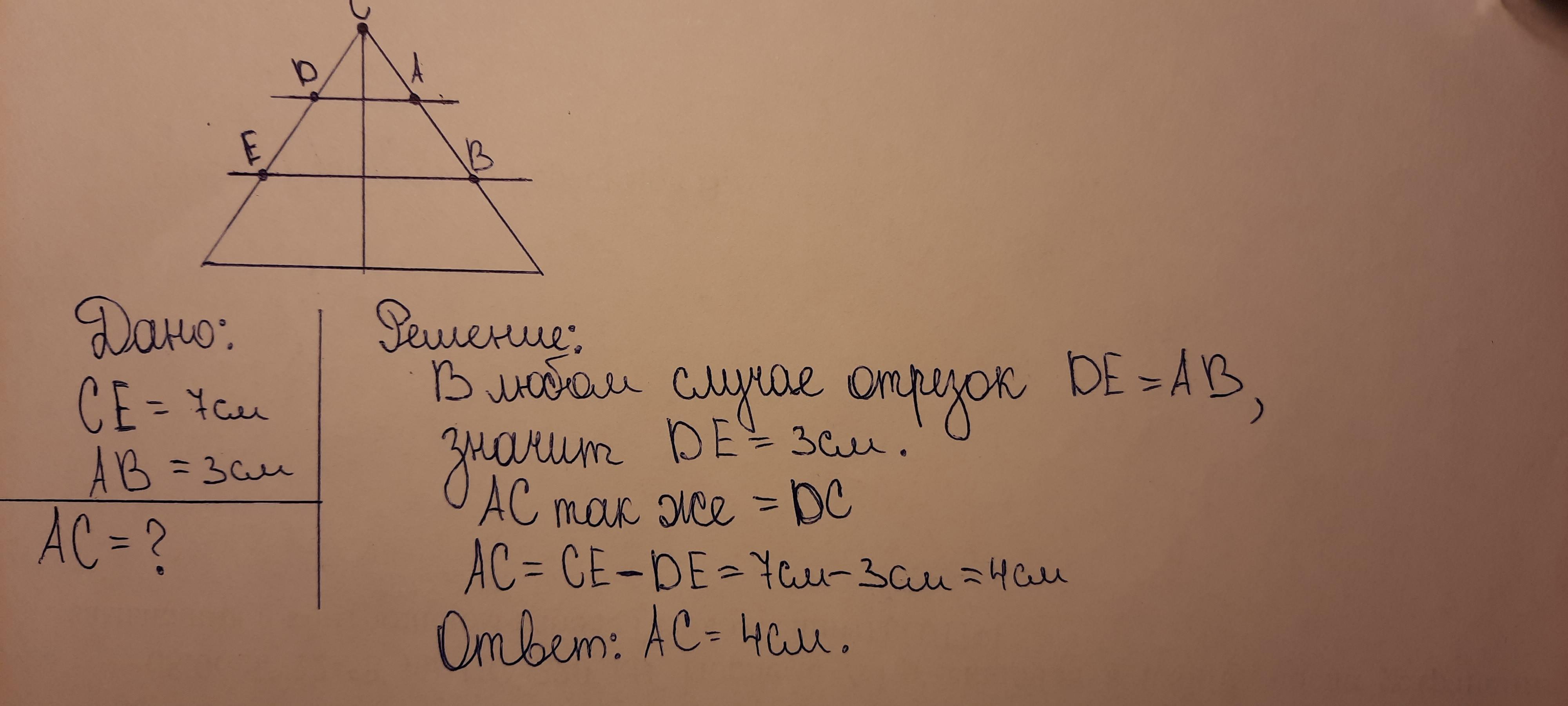Дан угол с вершиной С. Через точки А и В, лежащие на одной стороне угла, проведенные прямые, перпендикулярные к биссектрисе угла С, они пересекают другую сторону углав точках Д и Е соответственно. Найдите отрезок АС, если СЕ=7 и АВ=3. Нарисуйте чертёж, пожалуйста. ОЧЕНЬ СРОЧНО!!!!!