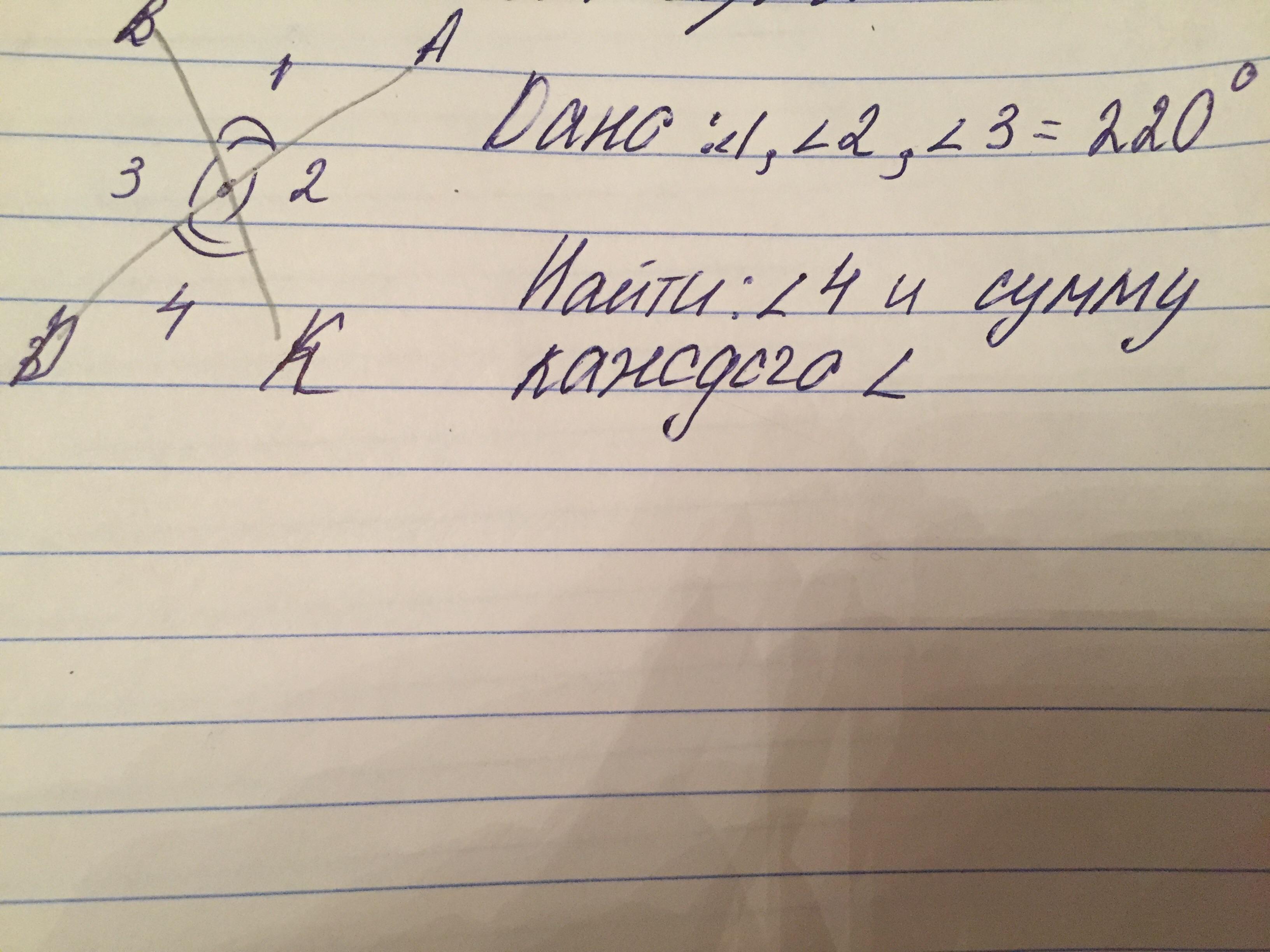 При пересечении двух прямых образовались четыре угла. Сумма трёх из них равна 220º. Найти каждый из этих четырёх углов. Построить чертёж.