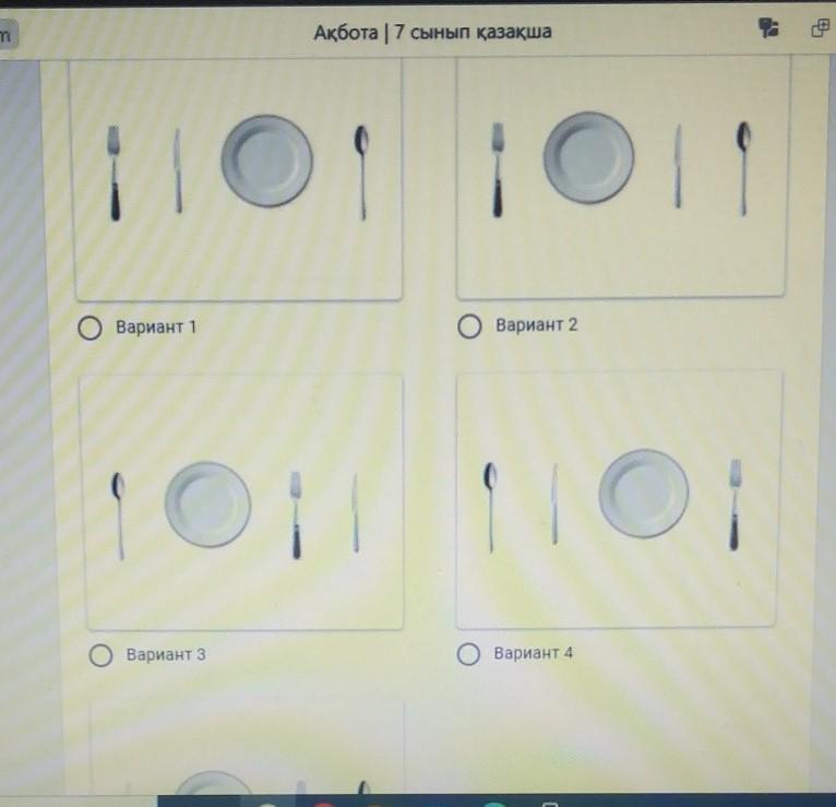 2)вариант.Вилка тарелканың сол жағында,пышақ оң жақта,одан кейін қасық түрады.
