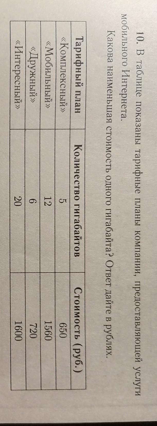10. В таблице показаны тарифные планы компании, предоставляющей услуги