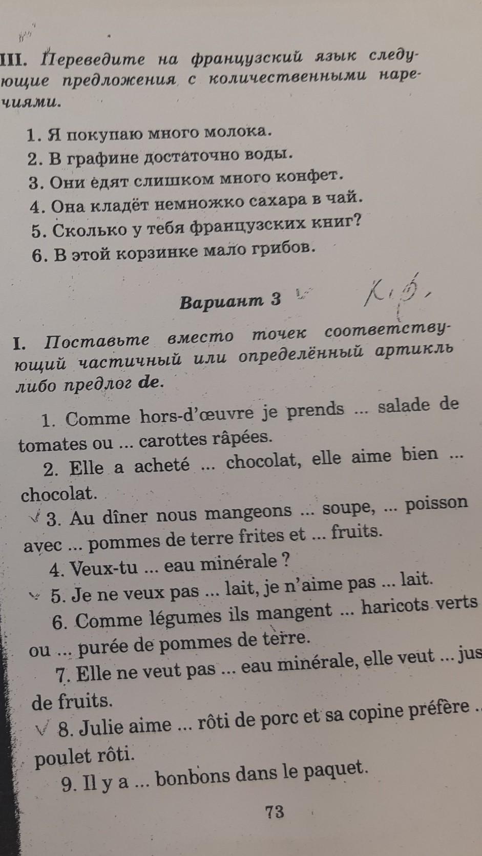 1. J'achète beaucoup de lait. 2. Il y a assez d'eau dans la carafe. 3. Ils mangent trop de bonbons. 4. Elle met un peu de sucre dans le thé. 5. Combien de livres français avez-vous? 6. Il y a peu de champignons dans ce panier.