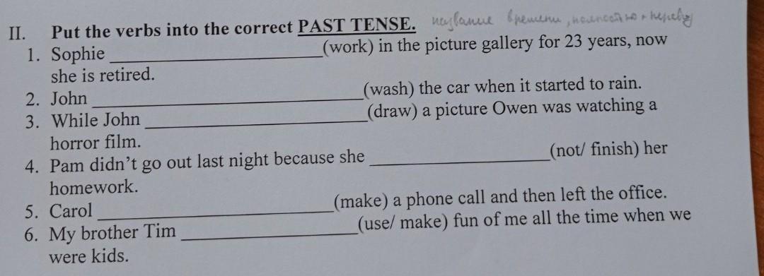 1--worked,2--wash,3--drawn,4--finishn't,5--make,6--just made