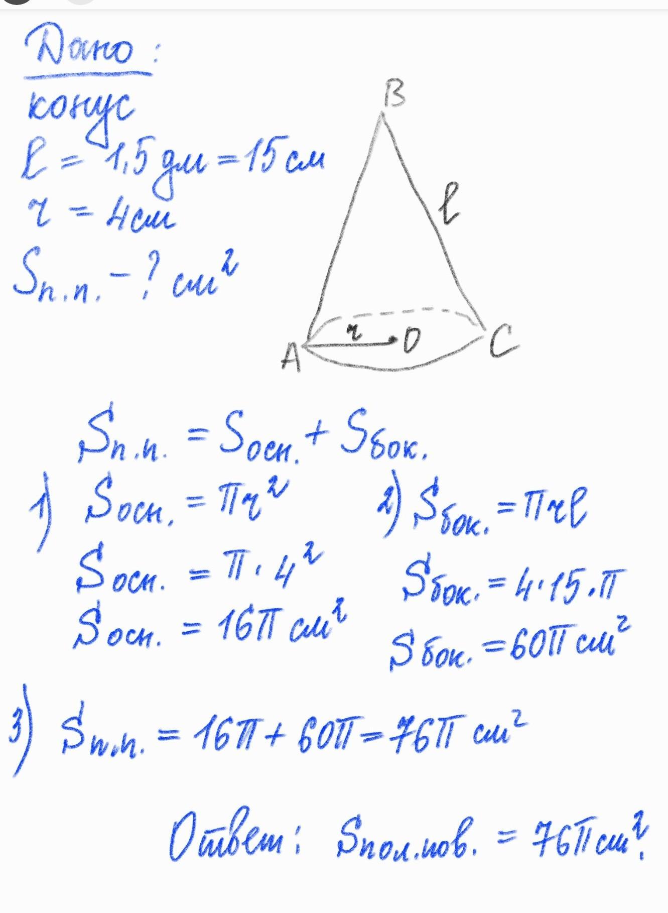 Вычеслите площадь боковой и полной поверхности конуса образующая которая равна 1,5 дм и радиус основания 4 см. (и рис. Пж)