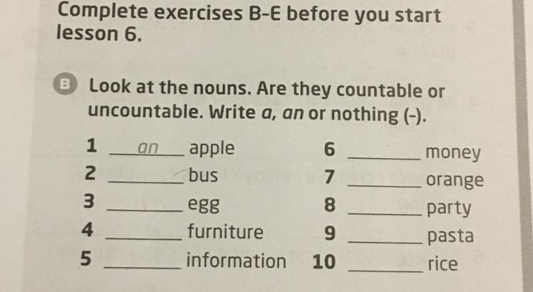 К словам нужно добавить артикль. Бывает определенный артикль the, а бывает неопределенный a или an. Неопределенный артикль (a/an) ставится перед исчисляемыми, т.е. перед предметами, которые можно исчислить(посчитать) и важно, что бы предмет был в ед.ч. (Т.е. нельзя сказать an apples -- это неправильно). Например: an apple (сколько яблок? одно яблоко (в данном случае артикль приобретает значение одного предмета).