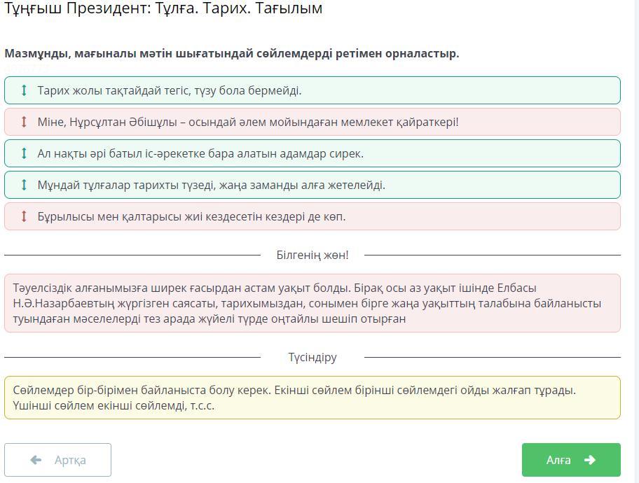 Мазмұнды, мағыналы мәтін шығатындай сөйлемдерді ретімен орналастыр.