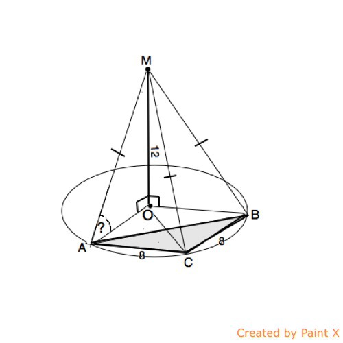 В треугольнике ABC, AC=CB=8, угол ACB= 120 градусов. Точка M удалена от плоскости треугольника на расстоянии 12 см. Точка M удалена от плоскости треугольника на расстоянии 12 см и находится на равном расстоянии от вершин треугольника ABC. Найти угол между MA и плоскостью треугольника ABC