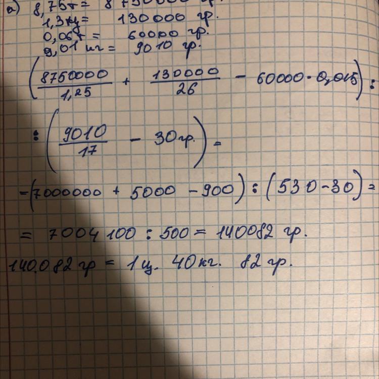 а) (8,75т : 1,25 + 1,3 ц : 26 – 0,06т ∙ 0,015) : (9, 01 кг: 17 –30г)