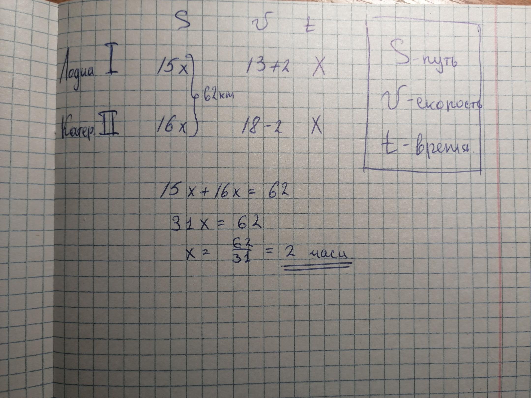 Отрезок пути 62 км. лодка прошла какую-то часть ( 15x ) от этого пути и катер прошел какую-то часть ( 16x ) от этого пути, но ,когда они встретились, вместе ими было пройдено 62 км. Части сложились.