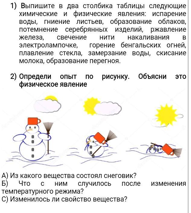 испар воды(физ), гниение листьев(хим), образ облаков(физ),потемнение изделий(хим),ржавение (хим),свечение нити(физ),горение огней(хим),плавление(физ),замерз воды(физ), скисание (хим), образ пкрегноя(хим)