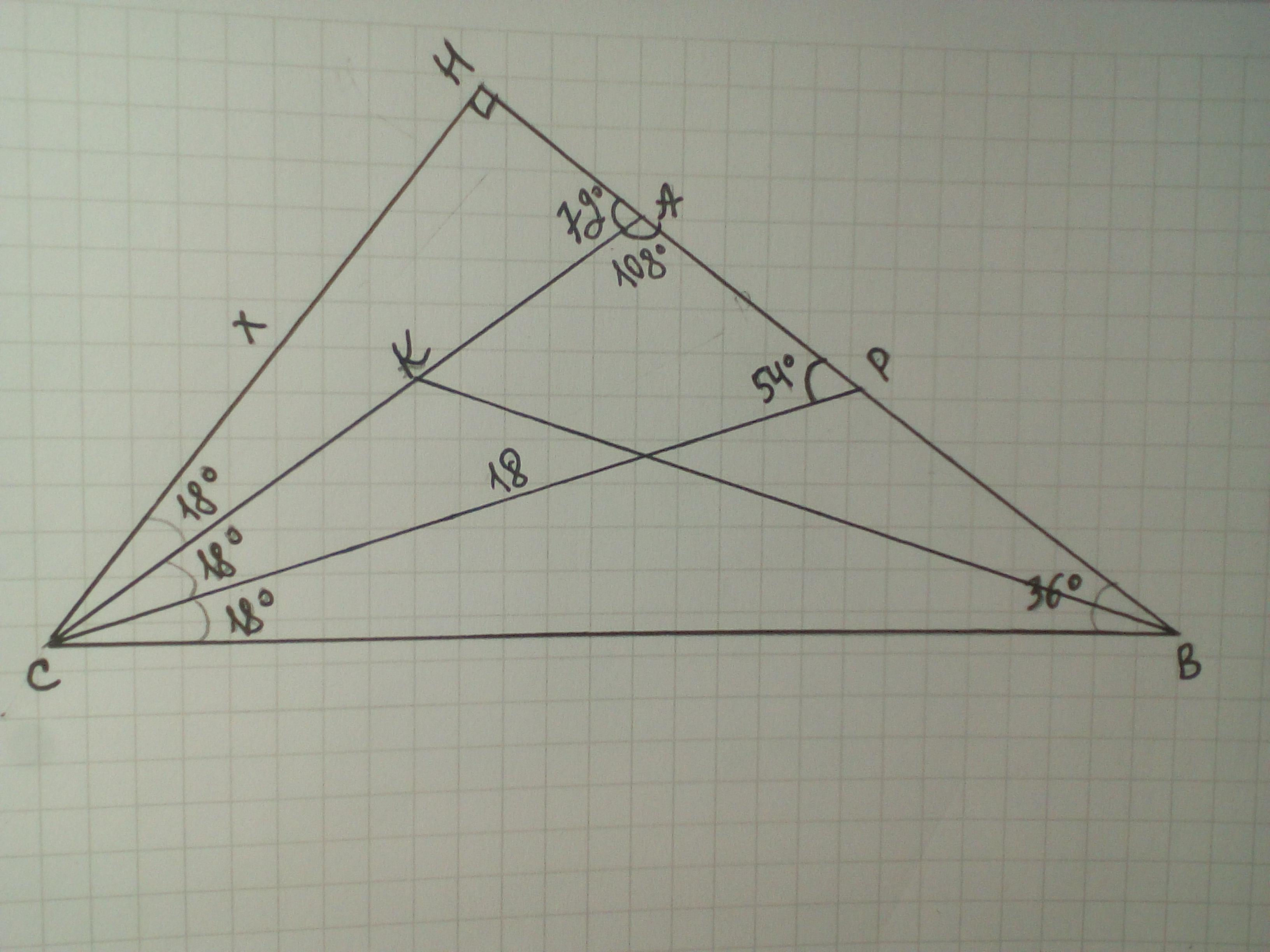 Дано: ΔАВС - равнобедренный, АВ=АС, ∠С=∠В=36°, ВК и СР - биссектрисы, ВК=СР=18 см. СН - высота. Найти СН.